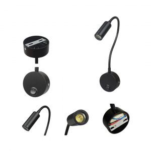 Aplique LED negro de 3W con brazo flexible de 30 cm, luz cálida de 3000K e interruptor integrado. Ideal para lectura en cabeceras o paredes.