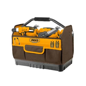 Bolso de herramientas INGCO HTBGL04 de 16″ con base de goma reforzada y siete bolsillos; diseñado para transportar hasta 15 kg de herramientas con facilidad, comodidad y organización profesional.
