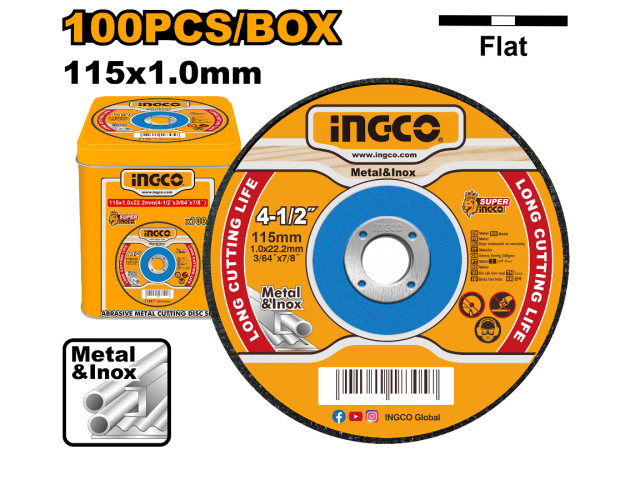 -115 mm (4-1/2″)*1,0 mm (3/64″)*22,2 mm (7/8″) -100 piezas/caja de metal -Centro plano -Disco de corte para metal e inox Embalado por caja de metal