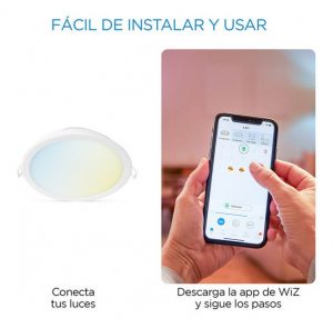 Embutido inteligente con WifI circular para cielorraso, potencia 24w / 1950Lm / en tonalidad de blanco ajustable, oscila entre blancos cálidos a fríos (2700K – 6500K) / Se controla mediante la app de WiZ o a través de asistentes de voz inteligentes, como Amazon Alexa, Siri o Google Assistant. / Vida útil: 20.000 hs. / Dimensiones: ø20.32cm.