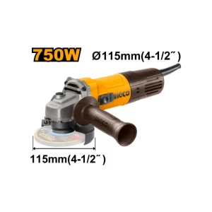 Amoladora angular INGCO AG75028 de 750 W con disco de 115 mm y mango auxiliar, combina potencia y control para cortes y acabados de precisión.