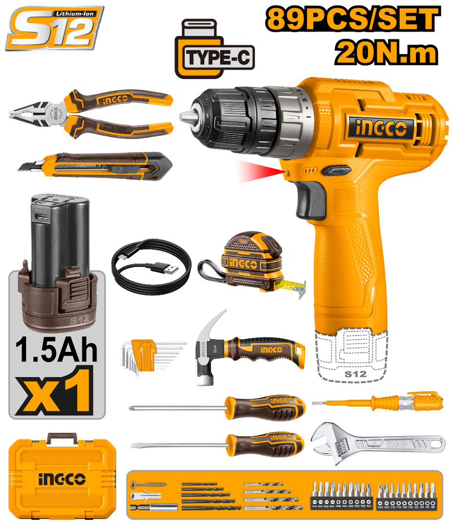 KIT ATORNILLADOR 12V 20nm EN VALIJA (CDLI12428) + 89 HERRAMIENTAS C/BAT Y CARGADOR INGCO
