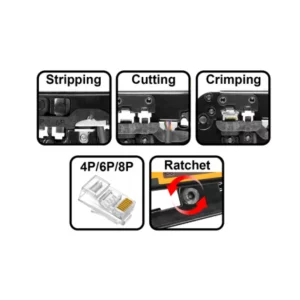 Este modelo soporta terminales modulares de tipo 4P, 6P y 8P (comúnmente para RJ-11, RJ-12 y RJ-45) lo que lo convierte en una herramienta versátil para instaladores, electricistas y técnicos de redes. Además de la función de crimpado, incorpora ranuras para pelado de cables y corte limpio, permitiendo un trabajo integral sin cambiar de herramienta.